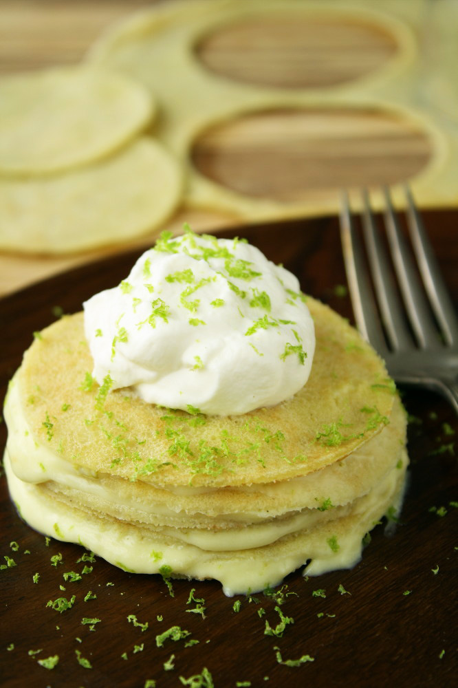 9. To assemble the key lime crepes, place first crepe on a plate, spread a thin layer of cream (recipe follows), add another crepe on top, another layer of cream, and continue, using 6 mini crepe rounds per stack. Makes 4 servings/crepe stacks.